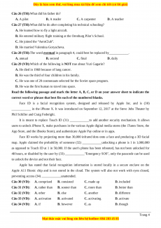 preventing access (34) ____________unattended. Câu 30 (VD): A. comprised B. consisted C. made up D. included Câu 31 (VD): A. rather than B. sooner than C. more than D. better than Câu 32 (VD): A. other B. else C. another D. different Câu 33 (VD): A. activation B. activated C. activating D. activate Câu 34 (VD): A. if B. however C. as D. though Trang 4