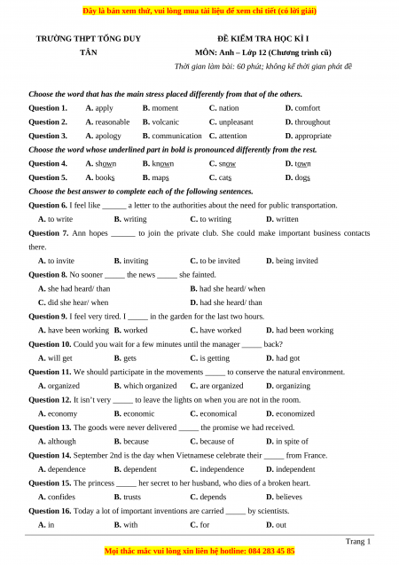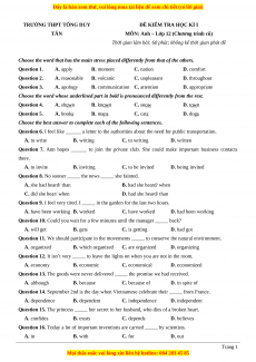 Tailieugiaovien.com.vn giới thiệu bộ 21 đề thi học kì 1 môn Tiếng Anh lớp 12 mới nhất năm 2022 - 2023 nhằm giúp Giáo viên có thêm tài liệu tham khảo ra đề thi Tiếng anh lớp 12.