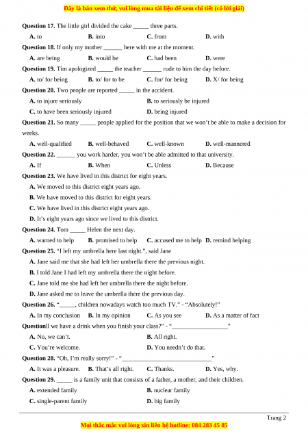 Question 24. Tom _____ Helen the next day. A. warned to help B. promised to help