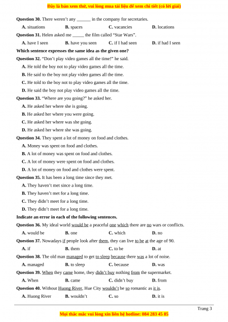 Question 40. Without Huong River, Hue City wouldn’t be so romantic as it is. A. Huong River B. wouldn’t C. so D. it is Trang 3
