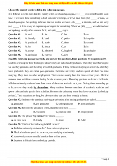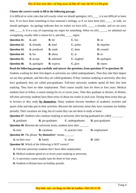 wrongdoing, usually offer a reason for it, and (46) _____ regret. Question 41. A. and B. for C. but D. so Question 42. A. friendly B. kind C. polite D. impolite Question 43. A. produced B. made C. done D. created Question 44. A. for B. about C. at D. in Question 45. A. accept B. admitted C. laughed D. apologize Question 46. A. apologize B. express C. give D. report