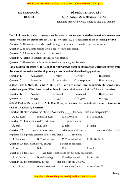 Tailieugiaovien.com.vn giới thiệu bộ 36 đề thi học kì 1 môn Tiếng Anh lớp 12 mới nhất năm 2022 - 2023 nhằm giúp Giáo viên có thêm tài liệu tham khảo ra đề thi Tiếng anh lớp 12.