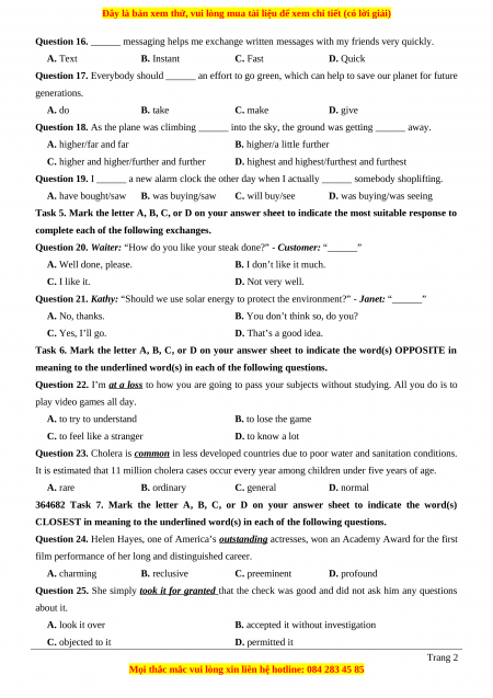 Question 16. ______ messaging helps me exchange written messages with my friends very quickly. A. Text B. Instant C. Fast D. Quick