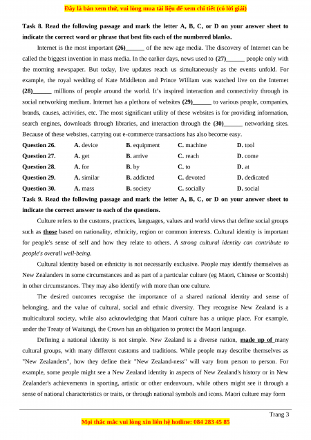 Because of these websites, carrying out e-commerce transactions has also become easy. Question 26. A. device B. equipment C. machine D. tool Question 27. A. get B. arrive C. reach D. come Question 28. A. for B. by C. to D. at Question 29. A. similar B. addicted C. devoted D. dedicated Question 30. A. mass B. society C. socially D. social