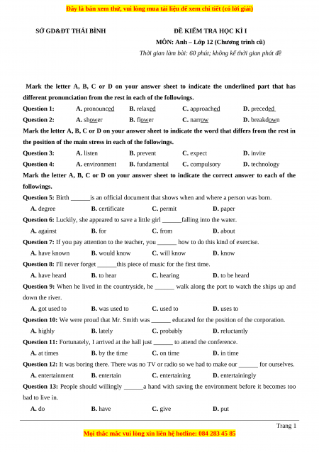 Tailieugiaovien.com.vn giới thiệu bộ 21 đề thi học kì 1 môn Tiếng Anh lớp 12 mới nhất năm 2022 - 2023 nhằm giúp Giáo viên có thêm tài liệu tham khảo ra đề thi Tiếng anh lớp 12.