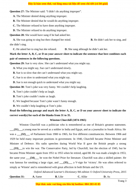 Oxford Advanced Learner's Dictionary 9th edition © Oxford University Press, 2015 Question 31: A. Same B. Like C. Alike D. As Trang 3
