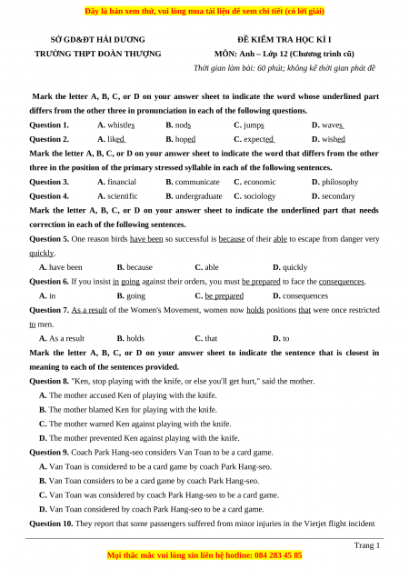 Tailieugiaovien.com.vn giới thiệu bộ 21 đề thi học kì 1 môn Tiếng Anh lớp 12 mới nhất năm 2022 - 2023 nhằm giúp Giáo viên có thêm tài liệu tham khảo ra đề thi Tiếng anh lớp 12.
