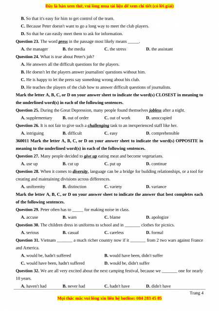 Question 32. We are all very excited about the next camping festival, because we _______ one for nearly 10 years. A. haven't had B. never had C. hadn't have D. didn't have Trang 4