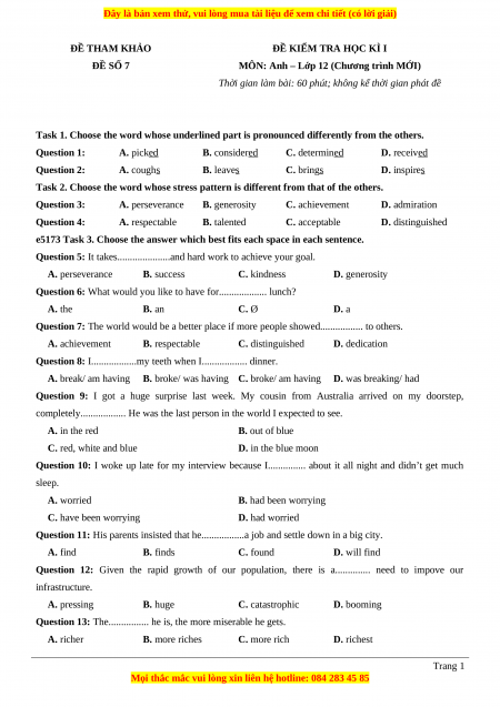 Tailieugiaovien.com.vn giới thiệu bộ 36 đề thi học kì 1 môn Tiếng Anh lớp 12 mới nhất năm 2022 - 2023 nhằm giúp Giáo viên có thêm tài liệu tham khảo ra đề thi Tiếng anh lớp 12.