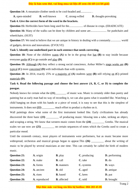 music to be played by several musicians at one time. This can certainly be called the birth of modern music. Question 21: A. origin B. play C. producing D. performing Question 22: A. make B. call C. take D. do Question 23: A. forms B. manners C. systems D. ways Question 24: A. ancient B. old C. aged D. antique Question 25: A. risen B. based C. keen D. put Question 26: A. reproduced B. affected C. sold D. brought Trang 2