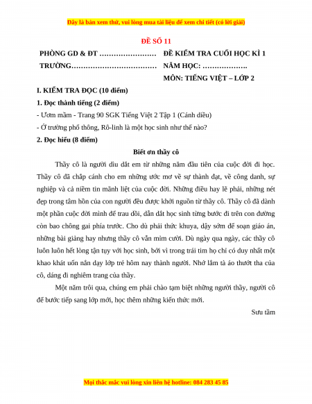 Đề thi học kì 1 Tiếng Việt lớp 2 Cánh diều - Đề 11