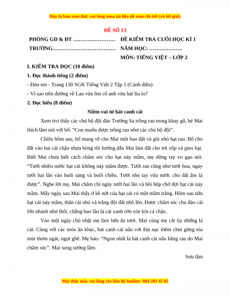 Đề thi học kì 1 Tiếng Việt lớp 2 Cánh diều - Đề 13