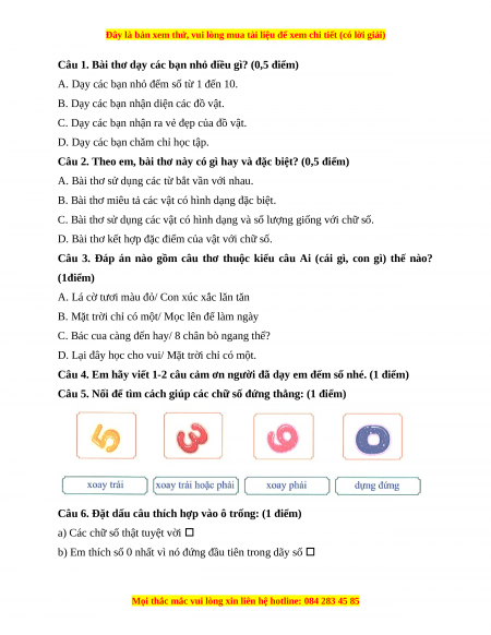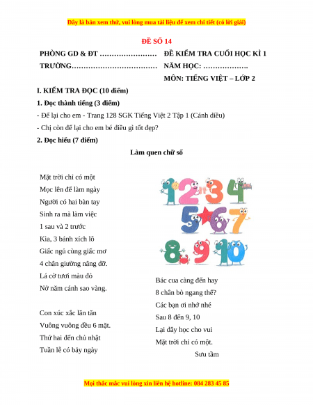 2. Đọc hiểu (7 điểm) Làm quen chữ số Mặt trời chỉ có một Mọc lên để làm ngày Người có hai bàn tay Sinh ra mà làm việc 1 sau và 2 trước Kìa, 3 bánh xích lô Giấc ngủ cùng giấc mơ