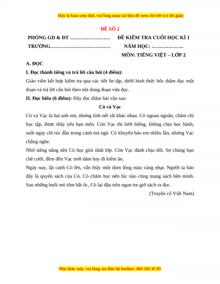 II. Đọc hiểu (6 điểm): Hãy đọc thầm bài văn sau: Cò và Vạc