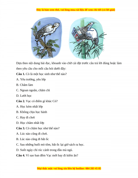Câu 2. Vạc có điểm gì khác Cò? A. Học kém nhất lớp B. Không chịu học hành C. Hay đi chơi D. Học chăm nhất lớp