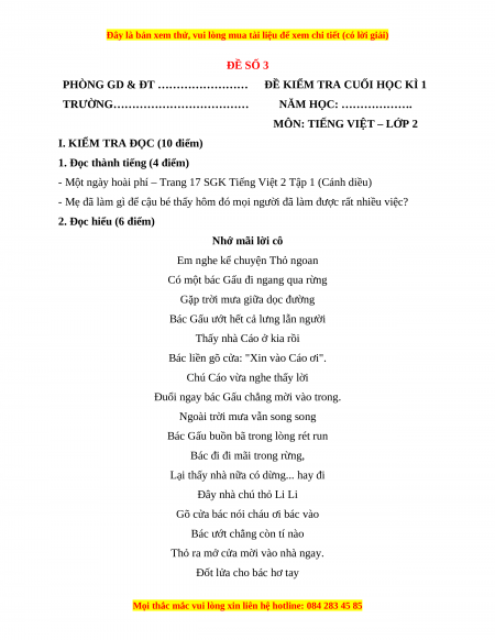 Đề thi học kì 1 Tiếng Việt lớp 2 Cánh diều - Đề 3