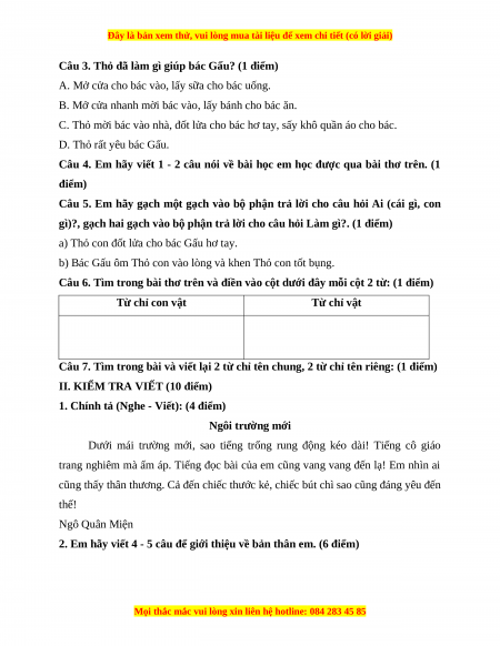 II. KIỂM TRA VIẾT (10 điểm)