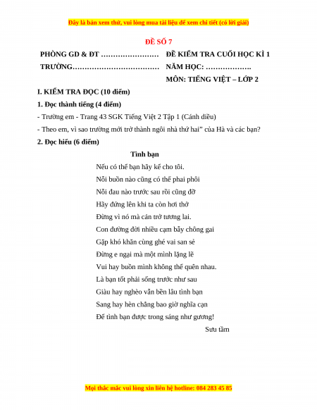 Đề thi học kì 1 Tiếng Việt lớp 2 Cánh diều - Đề 7