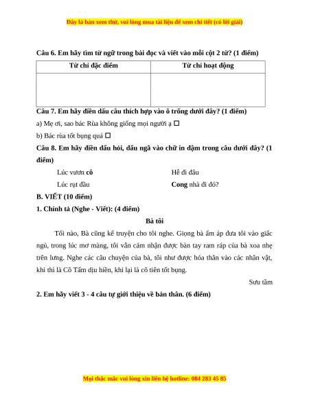 Câu 8. Em hãy điền dấu hỏi, dấu ngã vào chữ in đậm trong câu dưới đây? (1 điểm) Lúc vươn cô Hễ đi đâu Lúc rụt đầu Cong nhà đi đó? B. VIẾT (10 điểm)