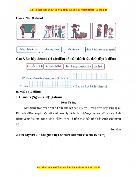 Câu 7. Em hãy thêm từ chỉ đặc điểm để hoàn thành câu dưới đây: (1 điểm) B. VIẾT (10 điểm)