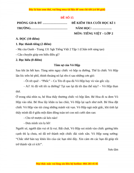 Đề thi học kì 1 Tiếng Việt lớp 2 Chân trời sáng tạo - Đề 15