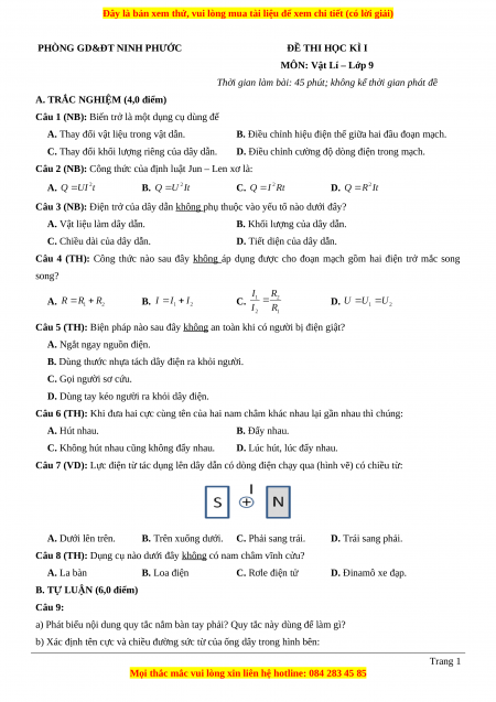 Đề thi học kì 1 Vật lí 9 năm 2023 Phòng GD_ĐT Ninh Phước
