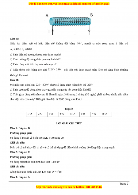 cho việc nấu cơm này? Biết giá tiền điện là 2000 đồng mỗi kW.h Đáp án 1-D 2-C 3-A 4-A 5-D 6-B 7-A 8-D LỜI GIẢI CHI TIẾT
