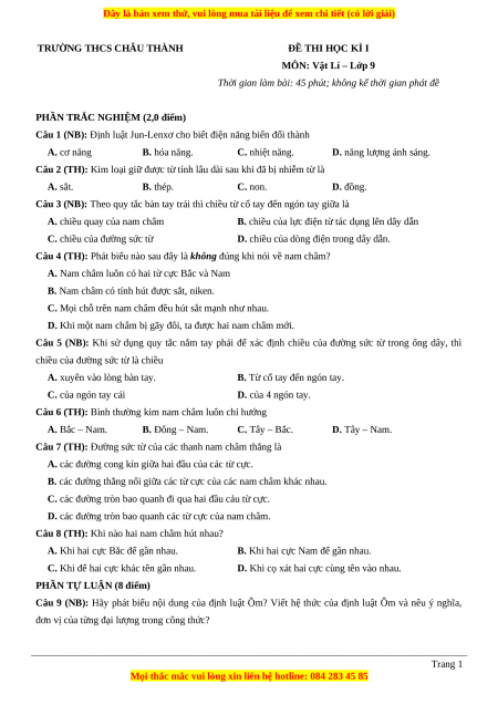 Đề thi học kì 1 Vật lí 9 năm 2023 trường THCS Châu Thành
