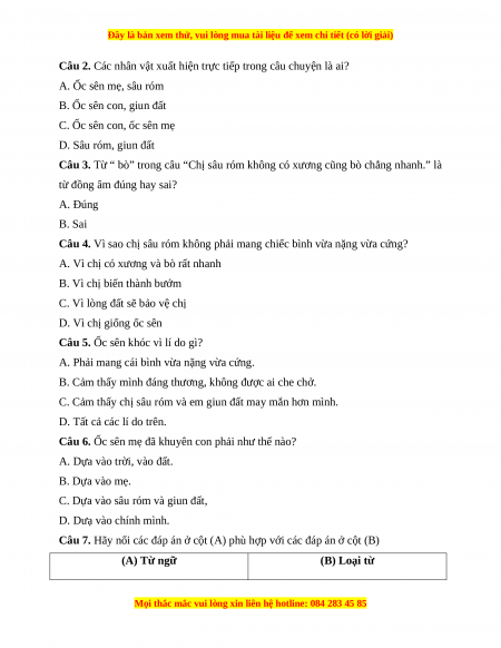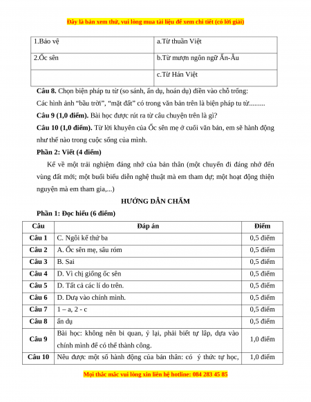 Phần 1: Đọc hiểu (6 điểm) Câu Đáp án Điểm Câu 1 C. Ngôi kể thứ ba 0,5 điểm Câu 2 A. Ốc sên mẹ, sâu róm 0,5 điểm Câu 3 B. Sai 0,5 điểm Câu 4 D. Vì chị giống ốc sên 0,5 điểm Câu 5