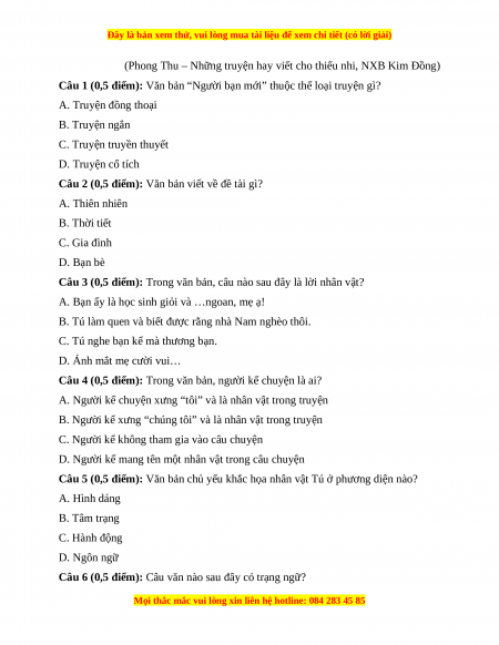 Câu 1 (0,5 điểm): Văn bản “Người bạn mới” thuộc thể loại truyện gì? A. Truyện đồng thoại B. Truyện ngắn C. Truyện truyền thuyết D. Truyện cổ tích