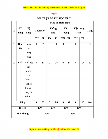 Mức độ nhận thức Kĩ Nội Thông Vận Vận dụng TT Nhận biết Tổng năng dung hiểu dụng cao TN TL TN TL TN TL TN TL 1 Đọc Văn 0 2 0 1 0 1 0 50 hiểu bản nghị luận 2 Viết Viết bài 0 1* 0 1* 0 1* 0 1* 50 văn đóng vai nhân vật kể lại một truyện cổ tích Tổng 0 25 0 25 0 40 0 10 100 Tỉ lệ % 25% 25% 40% 10% Tỉ lệ chung 50% 50%