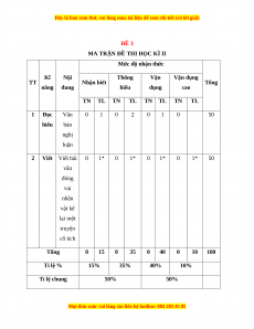 Mức độ nhận thức Kĩ Nội Thông Vận Vận dụng TT Nhận biết Tổng năng dung hiểu dụng cao TN TL TN TL TN TL TN TL 1 Đọc Văn 0 1 0 2 0 1 0 50 hiểu bản nghị luận 2 Viết Viết bài 0 1* 0 1* 0 1* 0 1* 50 văn đóng vai nhân vật kể lại một truyện cổ tích Tổng 0 15 0 35 0 40 0 10 100 Tỉ lệ % 15% 35% 40% 10% Tỉ lệ chung 50% 50%