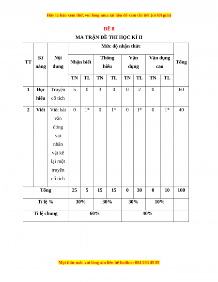 Mức độ nhận thức Kĩ Nội Thông Vận Vận dụng TT Nhận biết Tổng năng dung hiểu dụng cao TN TL TN TL TN TL TN TL 1 Đọc Truyện 5 0 3 0 0 2 0 60 hiểu cổ tích 2 Viết Viết bài 0 1* 0 1* 0 1* 0 1* 40 văn đóng vai nhân vật kể lại một truyện cổ tích Tổng 25 5 15 15 0 30 0 10 100 Tỉ lệ % 30% 30% 30% 10% Tỉ lệ chung 60% 40%