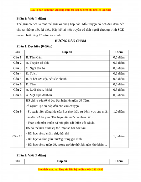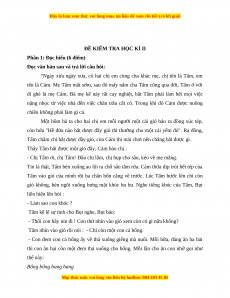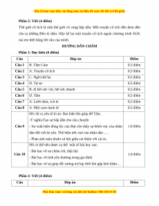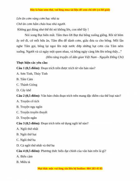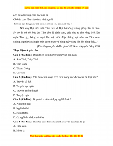 Câu 2 (0,5 điểm): Văn bản chứa đoạn trích trên mang đặc điểm của thể loại nào? A. Truyện cổ tích B. Truyện ngụ ngôn C. Truyện truyền thuyết D. Truyện ngắn