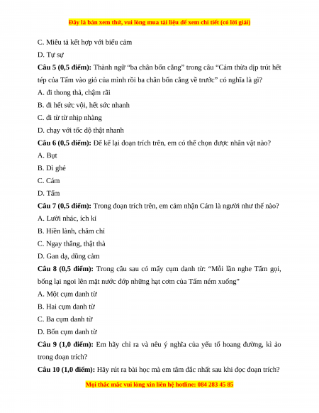 Câu 7 (0,5 điểm): Trong đoạn trích trên, em cảm nhận Cám là người như thế nào? A. Lười nhác, ích kỉ B. Hiền lành, chăm chỉ C. Ngay thẳng, thật thà D. Gan dạ, dũng cảm