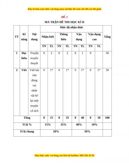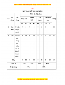 Mức độ nhận thức Kĩ Nội Thông Vận Vận dụng TT Nhận biết Tổng năng dung hiểu dụng cao TN TL TN TL TN TL TN TL 1 Đọc Truyện 0 2 0 2 0 1 0 50 hiểu truyền thuyết 2 Viết Viết bài 0 1* 0 1* 0 1* 0 1* 50 văn đóng vai nhân vật kể lại một truyện cổ tích Tổng 0 15 0 35 0 40 0 10 100 Tỉ lệ % 15% 35% 40% 10% Tỉ lệ chung 50% 50%