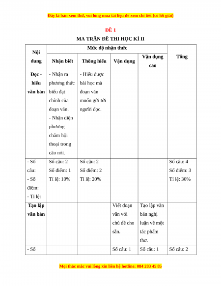 MA TRẬN ĐỀ THI HỌC KÌ II