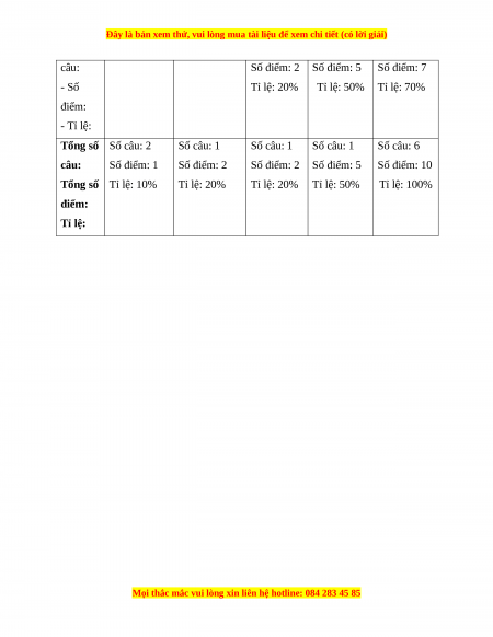 câu: Số điểm: 2 Số điểm: 5 Số điểm: 7 - Số Tỉ lệ: 20% Tỉ lệ: 50% Tỉ lệ: 70% điểm: - Tỉ lệ: