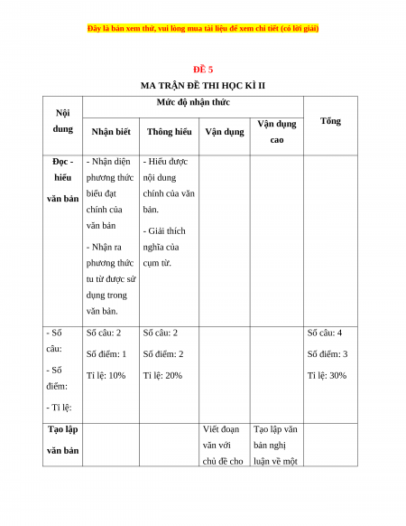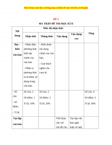 Mức độ nhận thức Nội Tổng Vận dụng dung Nhận biết Thông hiểu Vận dụng cao Đọc - - Nhận diện - Hiểu được hiểu phương thức nội dung biểu đạt chính của văn văn bản chính của bản. văn bản - Giải thích - Nhận ra nghĩa của phương thức cụm từ. tu từ được sử dụng trong văn bản. - Số Số câu: 2 Số câu: 2 Số câu: 4 câu: Số điểm: 1 Số điểm: 2 Số điểm: 3 - Số Tỉ lệ: 10% Tỉ lệ: 20% Tỉ lệ: 30% điểm: - Tỉ lệ: Tạo lập Viết đoạn Tạo lập văn văn với bản nghị văn bản