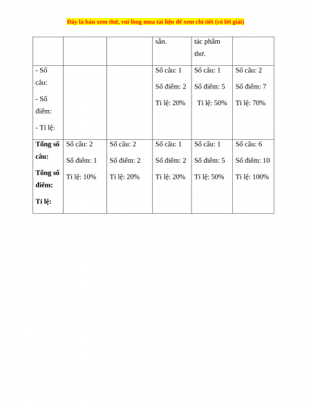 sẵn. tác phẩm thơ. - Số Số câu: 1 Số câu: 1 Số câu: 2 câu: Số điểm: 2 Số điểm: 5 Số điểm: 7 - Số Tỉ lệ: 20% Tỉ lệ: 50% Tỉ lệ: 70% điểm: - Tỉ lệ: