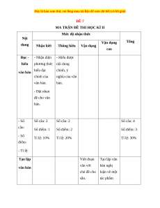 Mức độ nhận thức Nội Tổng Vận dụng dung Nhận biết Thông hiểu Vận dụng cao Đọc - - Nhận diện - Hiểu được hiểu phương thức nội dung biểu đạt chính, ý văn bản chính của nghĩa của văn văn bản. bản. - Đặt nhan đề cho văn bản. - Số Số câu: 2 Số câu: 2 Số câu: 4 câu: Số điểm: 1 Số điểm: 2 Số điểm: 3 - Số Tỉ lệ: 10% Tỉ lệ: 20% Tỉ lệ: 30% điểm: - Tỉ lệ: Tạo lập Viết đoạn Tạo lập văn văn với bản nghị văn bản