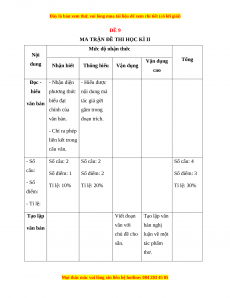 phương thức nội dung mà biểu đạt tác giả gửi văn bản chính của gắm trong văn bản. đoạn trích. - Chỉ ra phép liên kết trong câu văn. - Số Số câu: 2 Số câu: 2 Số câu: 4 câu: Số điểm: 1 Số điểm: 2 Số điểm: 3 - Số Tỉ lệ: 10% Tỉ lệ: 20% Tỉ lệ: 30% điểm: - Tỉ lệ: Tạo lập Viết đoạn Tạo lập văn văn với bản nghị văn bản