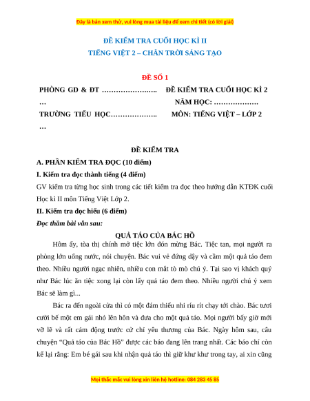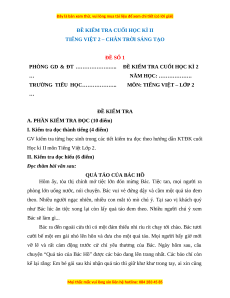 TIẾNG VIỆT 2 – CHÂN TRỜI SÁNG TẠO ĐỀ SỐ 1