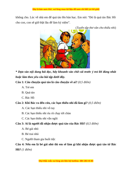 Câu 1: Câu chuyện quả táo là câu chuyện về ai? (0,5 điểm) A. Trẻ em B. Quả táo C. Bác Hồ