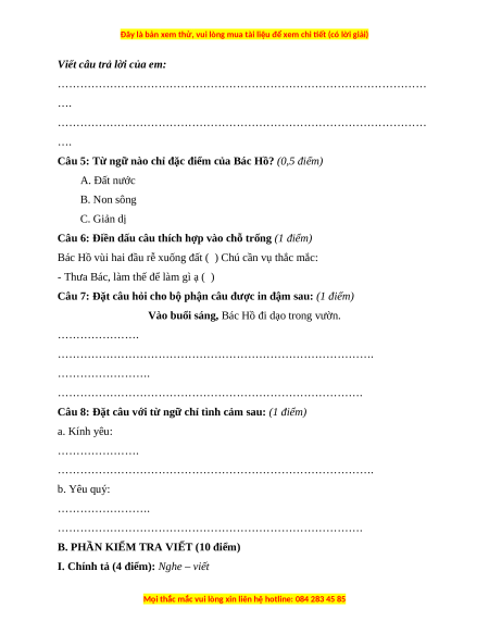 B. PHẦN KIỂM TRA VIẾT (10 điểm)