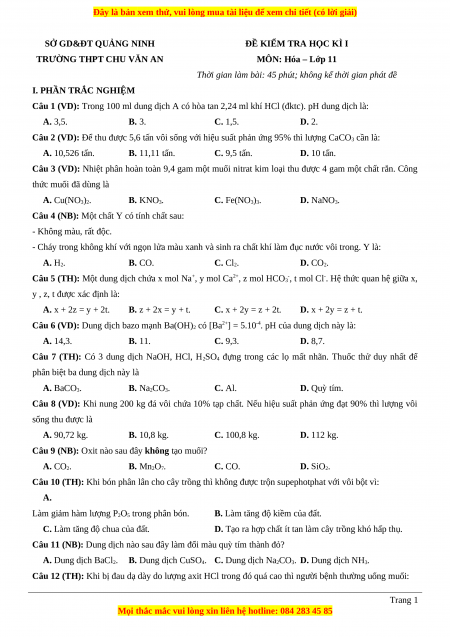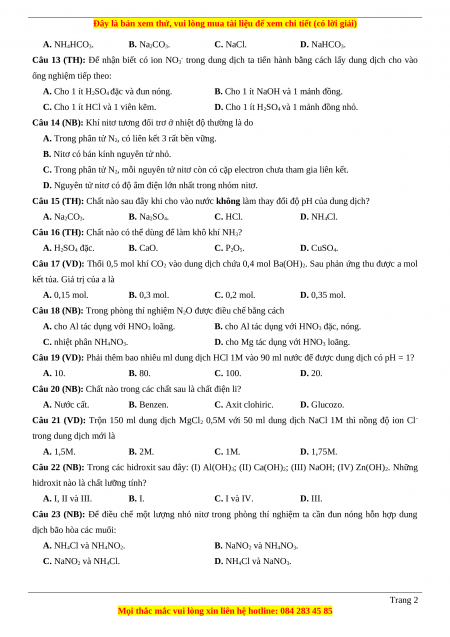 Câu 12 (TH): Khi bị đau dạ dày do lượng axit HCl trong đó quá cao thì người bệnh thường uống muối: Trang 1