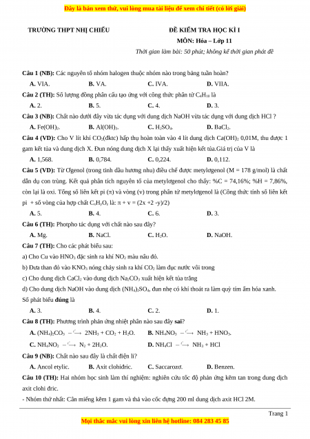 Câu 1 (NB): Các nguyên tố nhóm halogen thuộc nhóm nào trong bảng tuần hoàn? A. VIA. B. VA. C. IVA. D. VIIA.