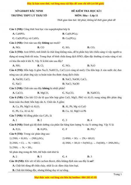 Đề thi học kì I Hóa lớp 11trường THPT Lý Thái Tổ - Bắc Ninh