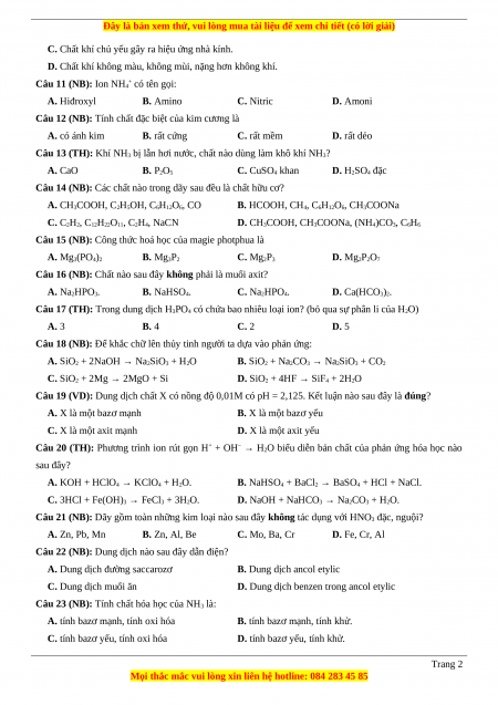 D. Chất khí không màu, không mùi, nặng hơn không khí. Câu 11 (NB): Ion NH + 4 có tên gọi: A. Hiđroxyl B. Amino C. Nitric D. Amoni