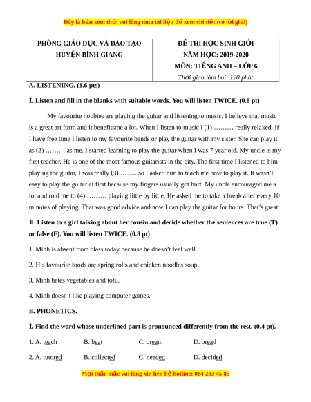 Đây là bản xem th , vu ử i lòng mua tài li u ệ đ xe ể m chi ti t (c ế ó l i ờ gi i ả ) PHÒNG GIÁO D C Ụ VÀ ĐÀO T O Ạ ĐỀ THI H C Ọ SINH GI I Ỏ HUY N Ệ BÌNH GIANG NĂM H C: Ọ 2019-2020 MÔN: TI NG Ế ANH – L P Ớ 6 Th i